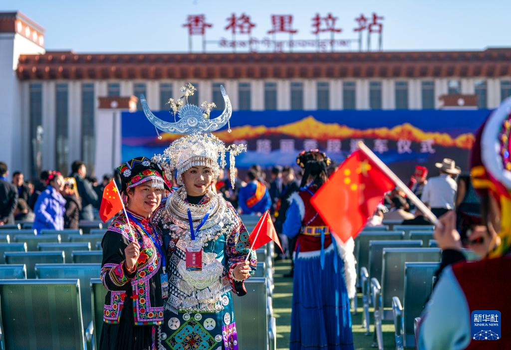 11月26日,参加丽香铁路开通仪式的少数民族代表用手机拍照留念。目前,中国移动已实现丽香铁路及沿线周边区域4/5G信号100%覆盖。新华社记者 陈欣波 摄