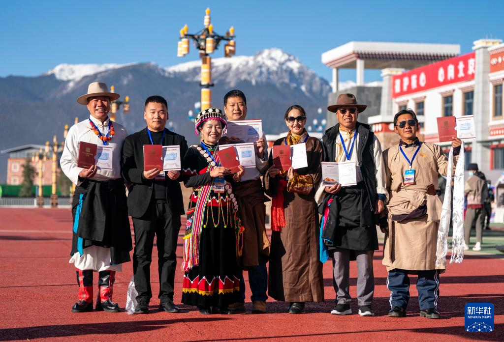 11月26日,参加丽香铁路开通仪式的少数民族代表在开通仪式上拍照留念。新华社记者 陈欣波 摄