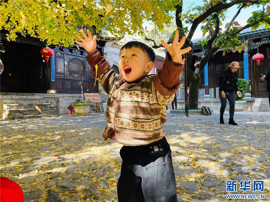 云南省大理白族自治州洱源县凤羽镇凤翔书院内的古银杏树迎来观赏期,小朋友在银杏树下玩耍(11月17日摄)。新华网发(罗丹 摄)