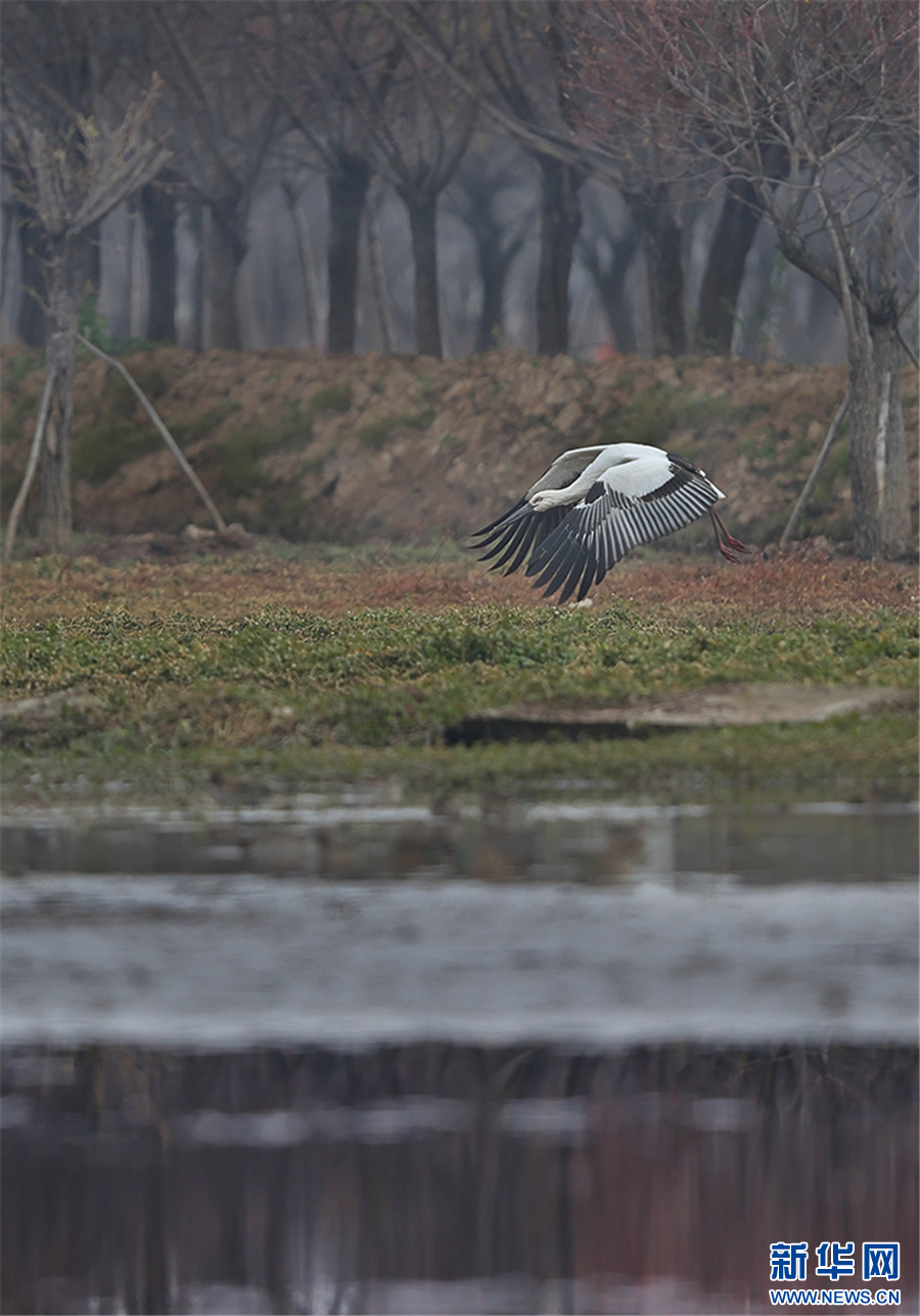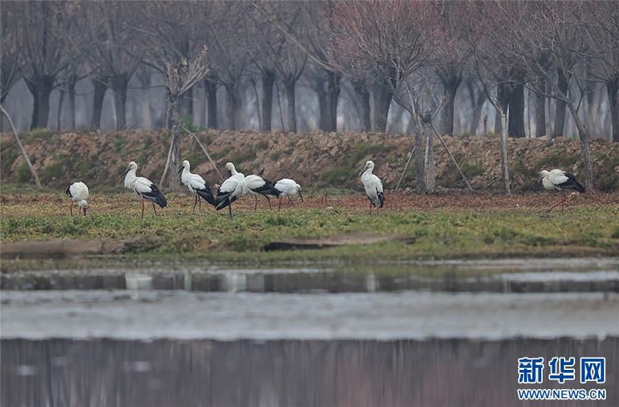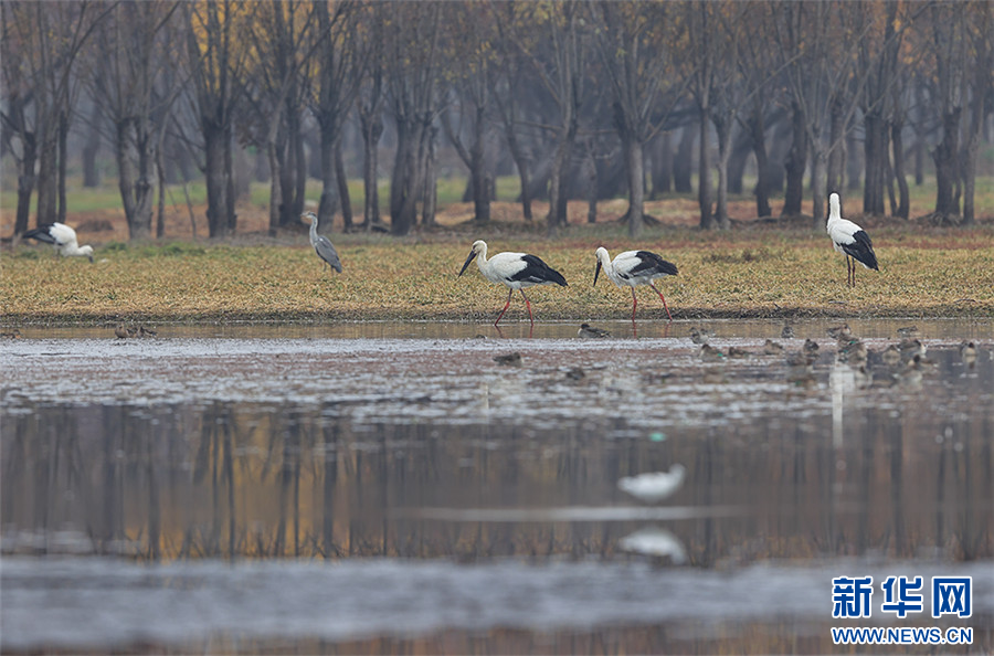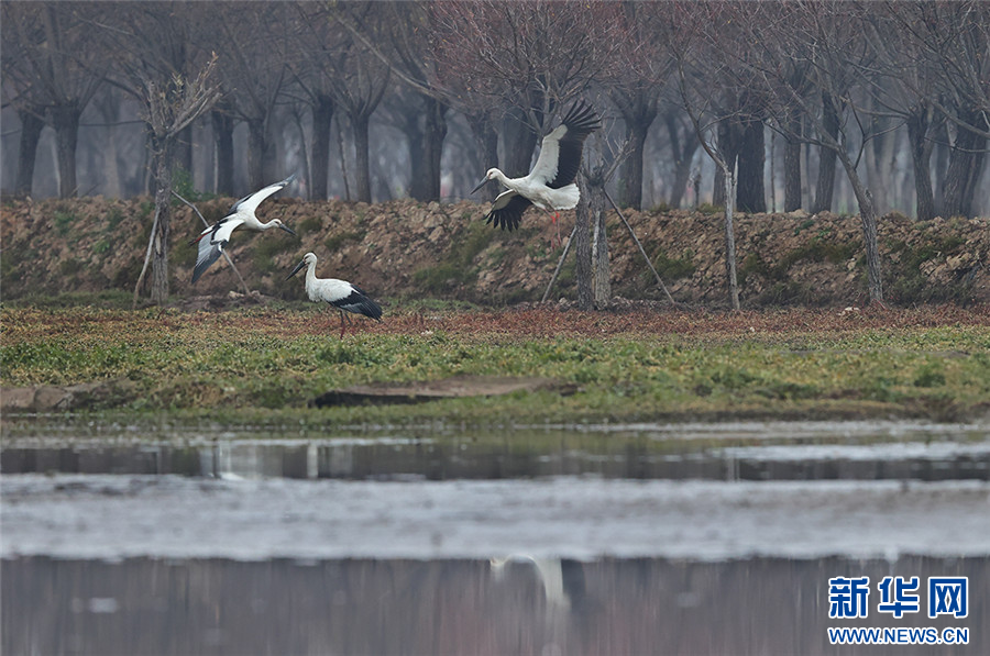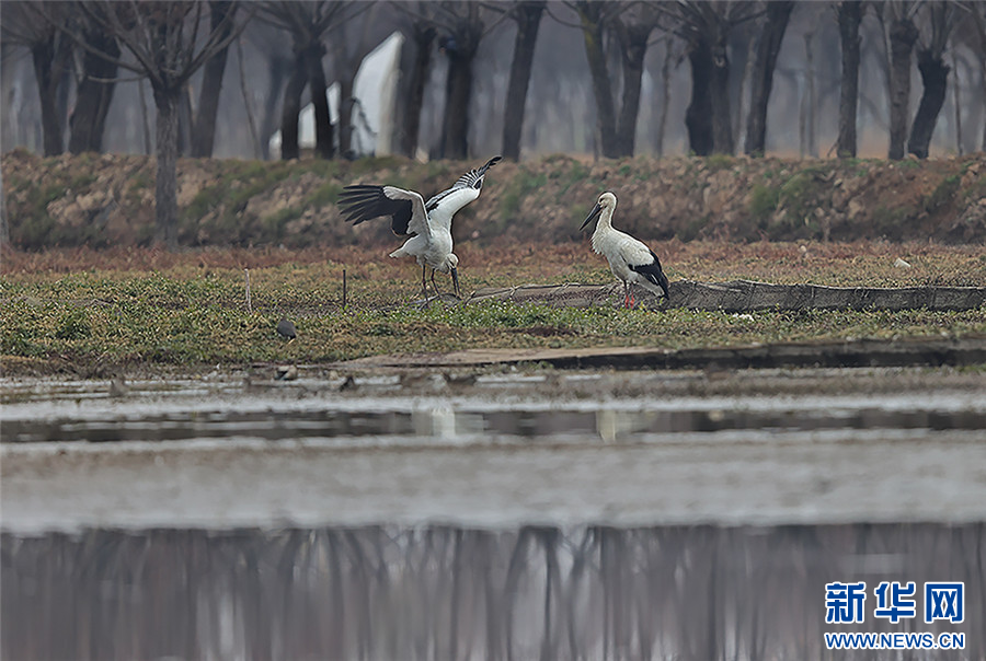 东方白鹳在剑湖湿地觅食、嬉戏(11月29日摄)。新华网发(杨学飞 摄)