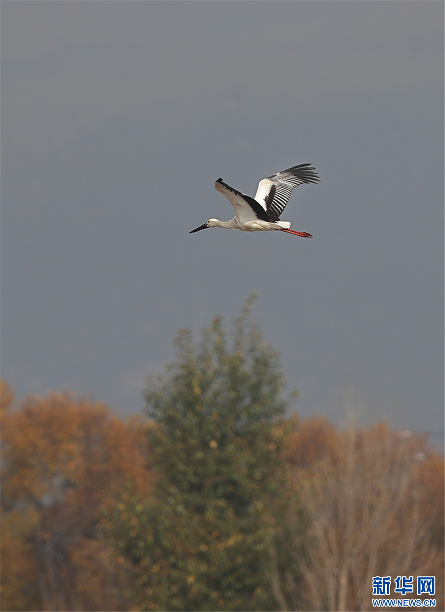 东方白鹳在剑湖低空飞翔(11月29日摄)。新华网发(杨学飞 摄)