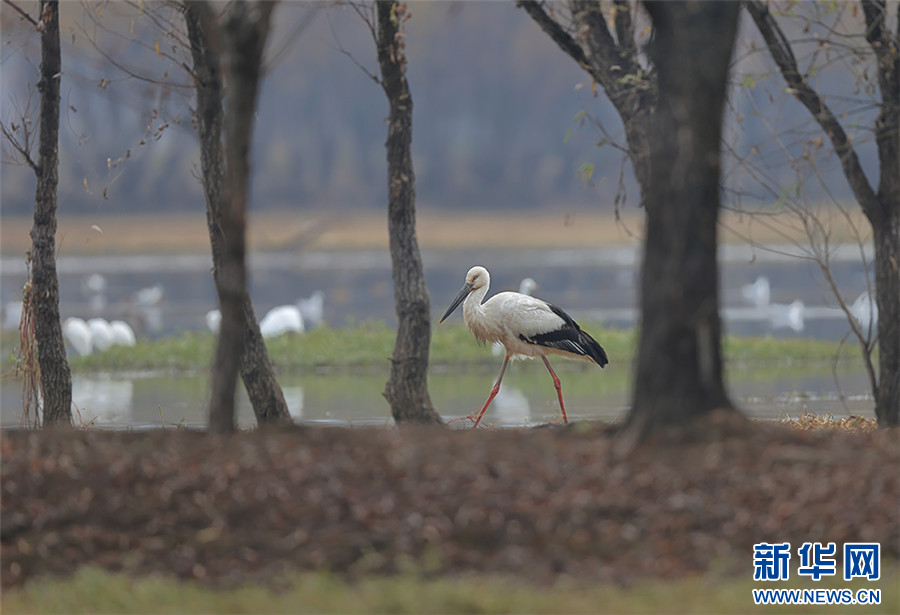 东方白鹳在剑湖湿地觅食(11月29日摄)。新华网发(杨学飞 摄)