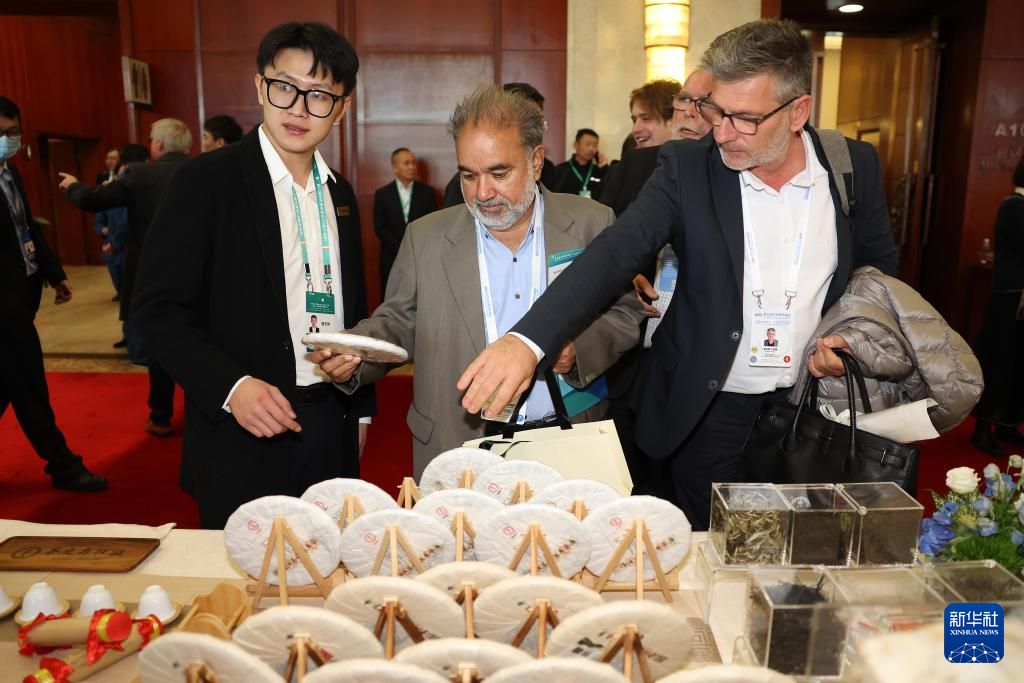 12月5日,在云南昆明参加第五届世界媒体峰会(云南分会场)暨第二届大象国际传播论坛的参会代表了解云南普洱茶。新华社记者李明摄