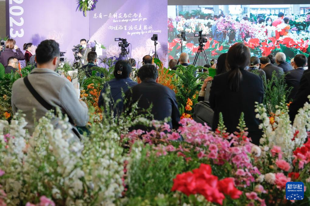 12月5日,在云南昆明参加第五届世界媒体峰会(云南分会场)暨第二届大象国际传播论坛的参会代表拍摄展出的鲜花墙。新华社记者 胡超 摄