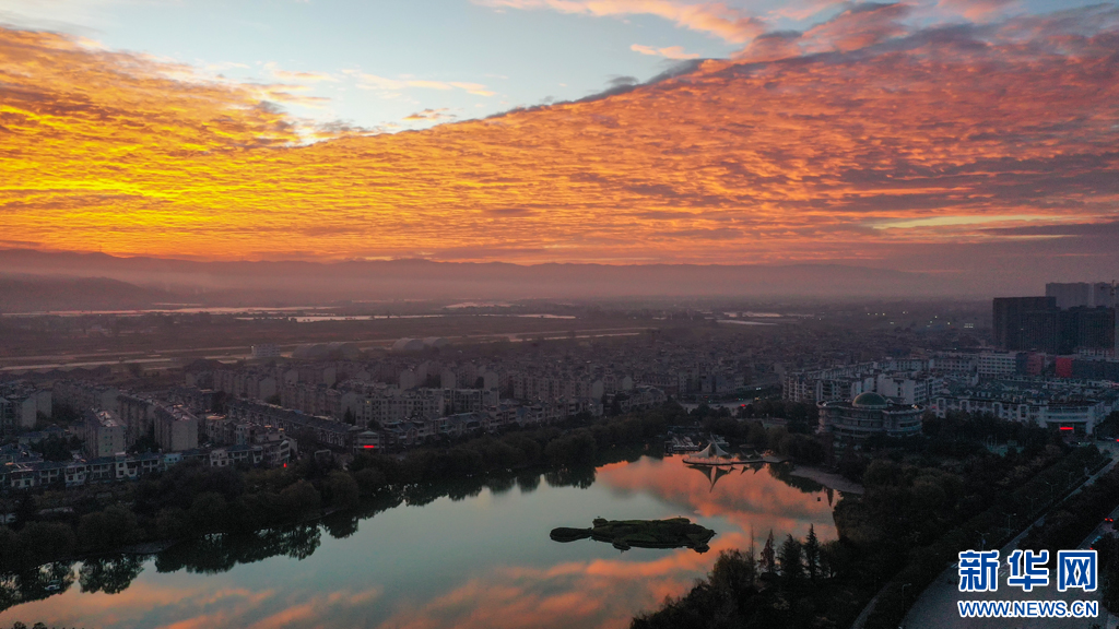 7日清晨,云南省曲靖市的上空出现火烧云美景。在沾益区玉林广场,瑰丽多彩的朝霞倒映在九龙湖中,仿佛油画一般,美得令人惊艳。(孙文来)