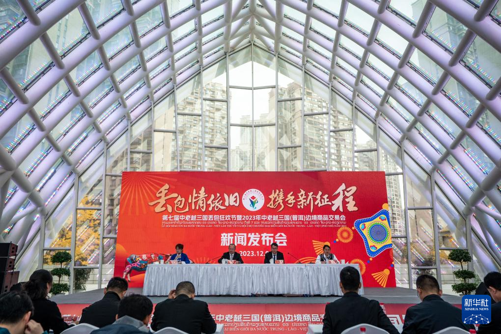 第七届中老越三国丢包狂欢节暨2023年中老越三国(普洱)边境商品交易会新闻发布会现场(12月8日摄)。