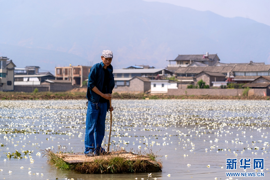 海菜花,一种白花黄蕊的沉水植物,对水质要求非常高,只有在温暖清澈的河湖里才能生长,被誉为“清流精灵”。海菜花的茎叶口感鲜嫩,是一种美味的食材,大理当地老百姓称之为“海菜”。近年来,洱源县在推进洱海流域水质保护与农业转型升级的过程中,将人工种植海菜作为一大绿色生态产业进行扶持和培育,目前,东湖的松曲、永安等地已实现连片种植,总面积2300多亩,年产量可达4300多吨。