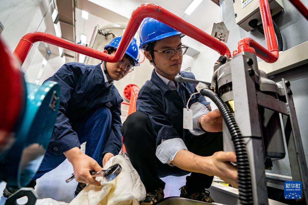 工作人员在右岸地下厂房对水轮发电机组调速器压力油泵出口过滤器滤芯进行检查(12月22日摄)。新华社记者 胡超 摄