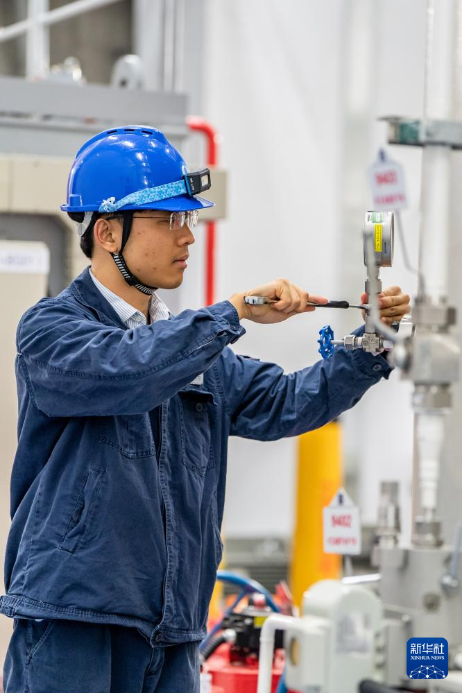 工作人员在右岸地下厂房对水轮发电机组调速器压力油罐压力表进行检查更换(12月22日摄)。新华社记者 胡超 摄