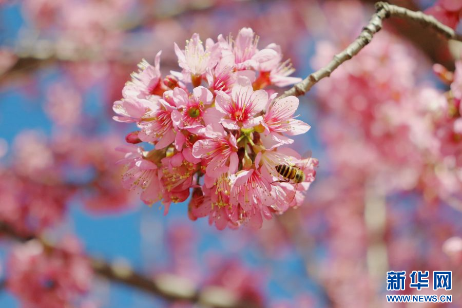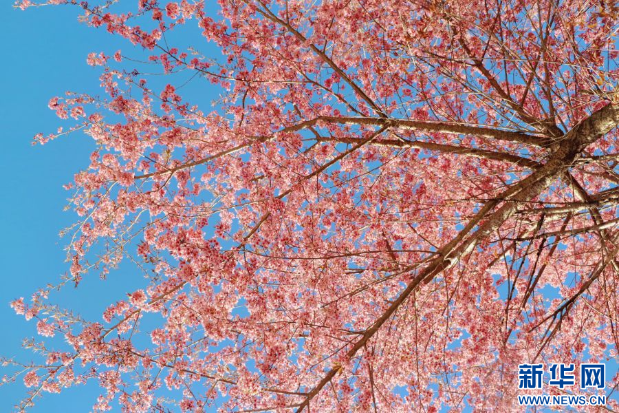 近日,云南省楚雄彝族自治州南华县龙川镇岔河村的冬樱花竞相绽放,蓝天白云下,冬樱花与天空互相映衬,形成一道靓丽的风景线。(李娅洁)