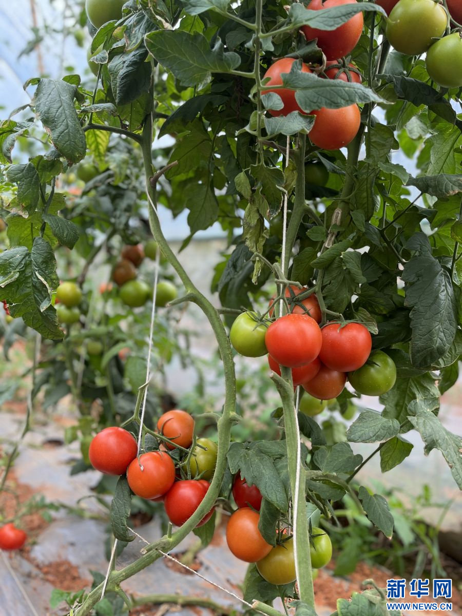 另一端,永裕社区蔬菜示范基地的工人们正在大棚里忙着采摘番茄。放眼望去,番茄树比工人们的个头还高,树上挂满了色泽鲜艳、大而饱满的番茄,看着甚是喜人。