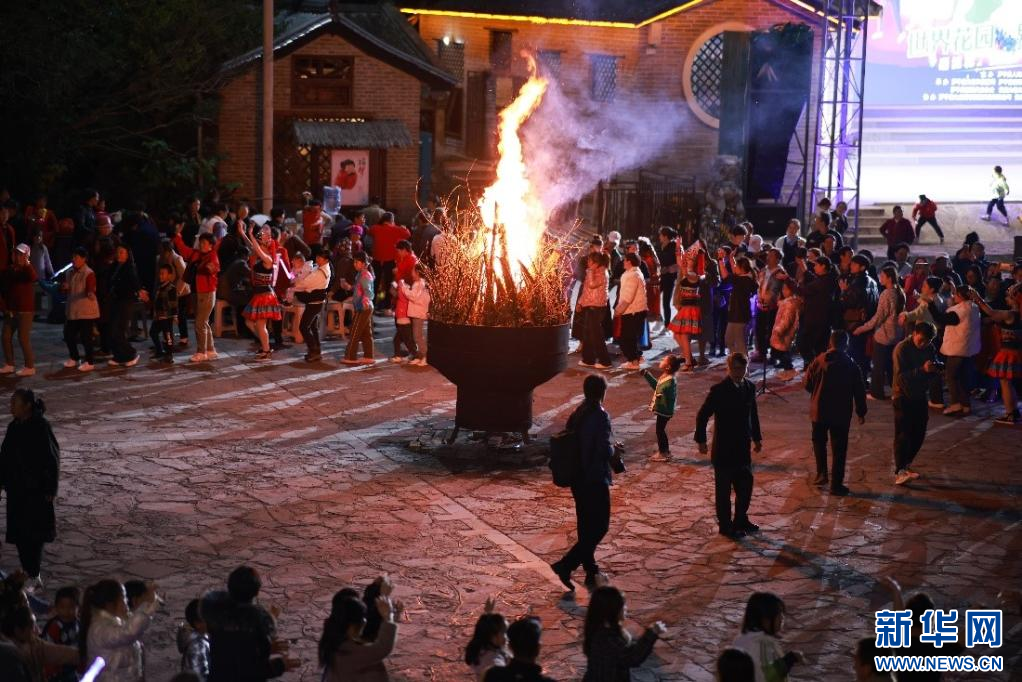 12月23日傍晚7点,在云南省曲靖市罗平县相石阶森林公园广场舞舞台上,一群身着民族服装的人,弹着弦子,和着调子,彼此对视着围成圈,跳起了布依族传统的打跳舞。