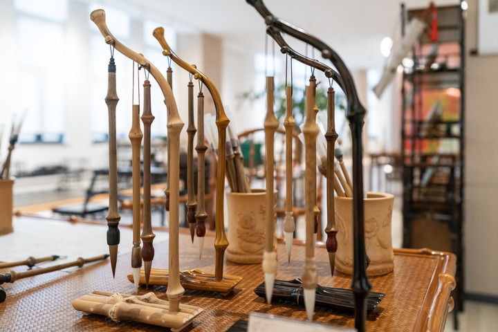 在云南昭通市大关县“80后”返乡创业者欧贤芹的筇竹家具企业内拍摄的筇竹毛笔及毛笔架(2023年10月31日摄)。新华社记者 陈欣波 摄