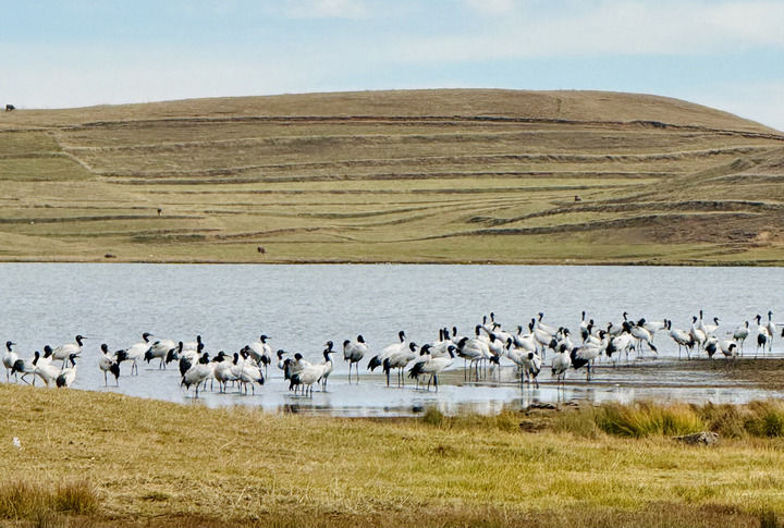 在云南昭通大山包黑颈鹤国家级自然保护区拍摄到的黑颈鹤(2023年11月2日摄)。新华社发(吴太平 摄)