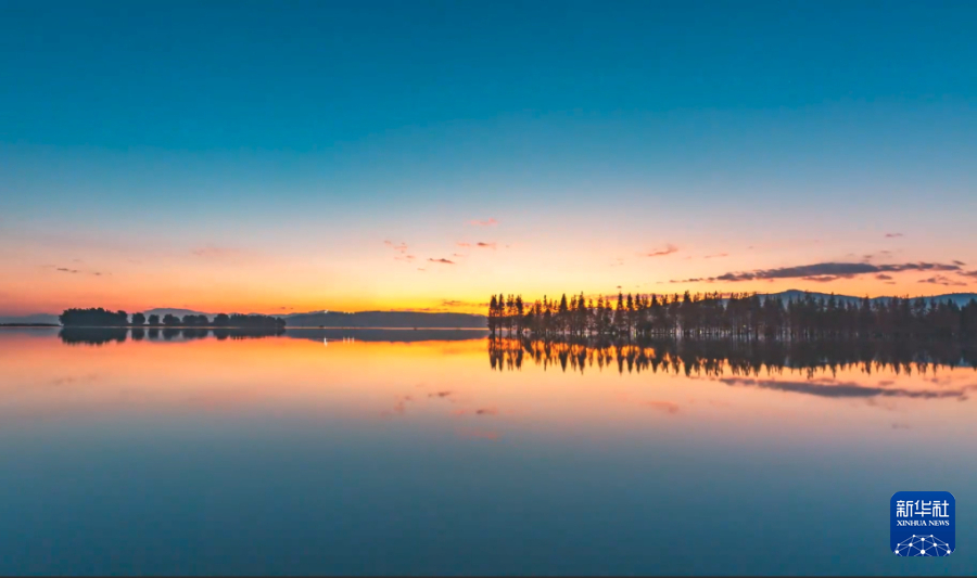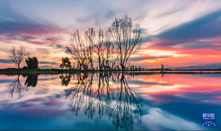 冬日,位于云南晋宁的南滇池湿地,晨曦中,云朵掩映红日,霞光绽放,唤醒万物。