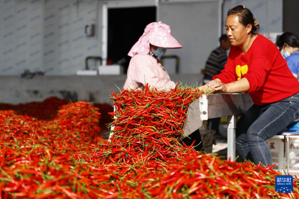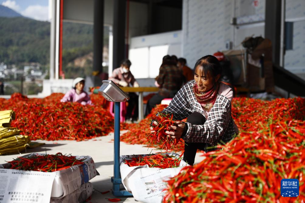 云南省普洱市景东县水果蔬菜交易中心工人们正在分拣辣椒。新华社记者 何春好 摄