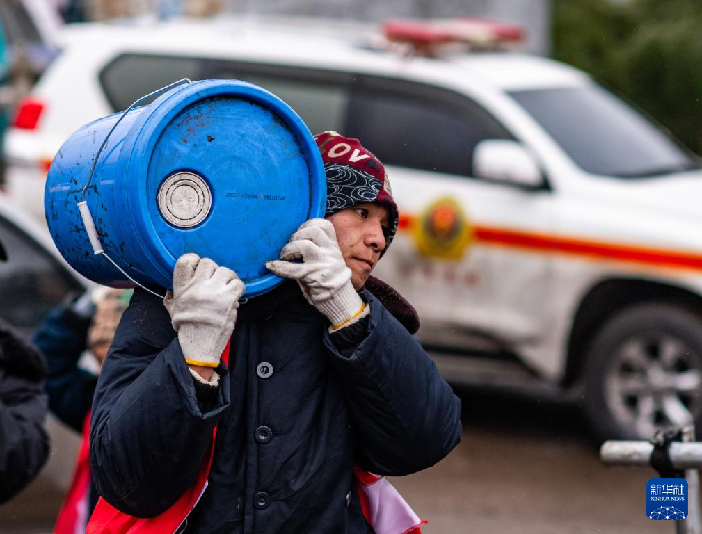 1月24日,自愿报名参加志愿服务的凉水村村民王再云往现场搬运物资。