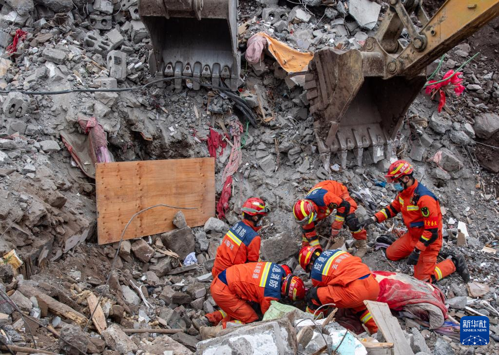 1月24日,来自昭通市消防救援支队的余文豪(左上)和其他救援人员一起在现场救援。