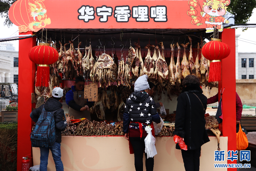 顾客购买腊肉和火腿鸭(1月24日摄)。新华网发(杨雯 摄)