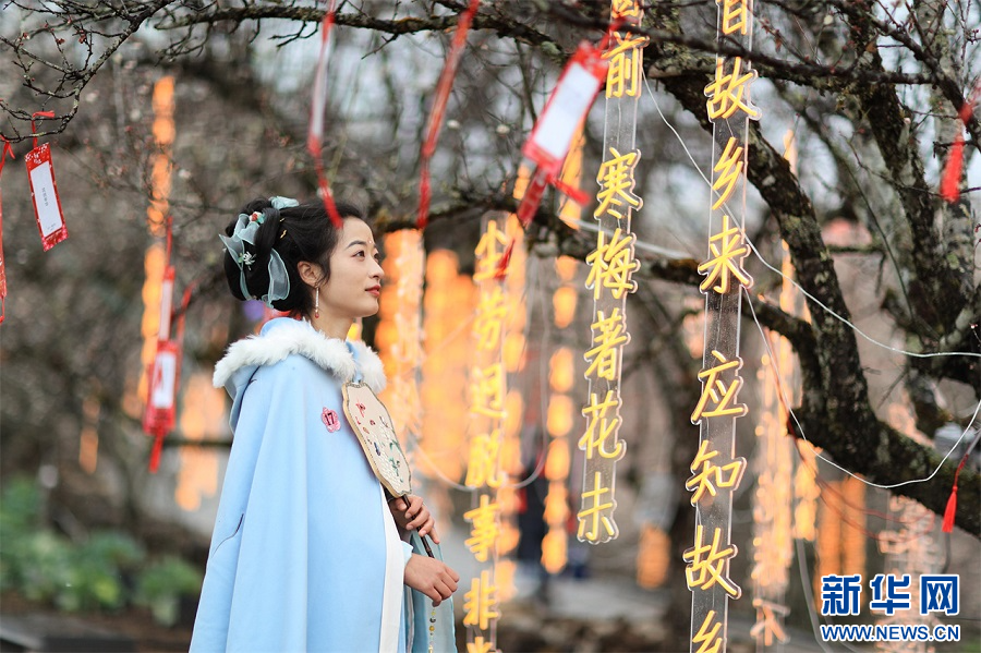 穿着汉服的赵女士正在一边赏梅,一边猜灯谜。“中营梅花节也有汉服活动,我觉得穿着汉服赏梅别有一番韵味,今天在这里不仅欣赏到了美景,也结识了很多喜欢汉服的朋友。”赵女士说。
