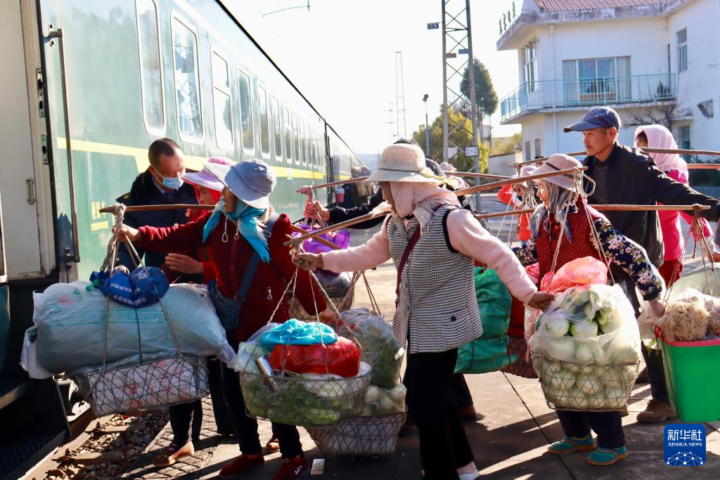 列车刚到云南省曲靖市马龙区吴官田站,路边挑扁担、背背篓的菜农已在等待车门开启。
