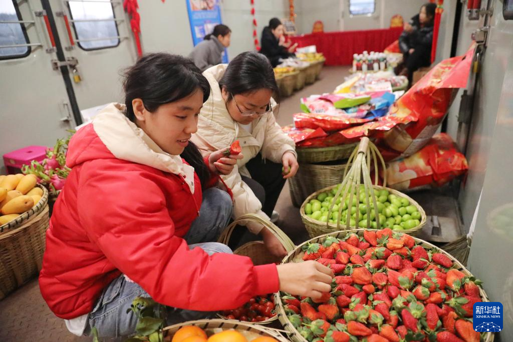 春节临近,家家户户忙着采买年货。中国铁路昆明局集团有限公司在云南昆明至元谋西的公益性“慢火车”7466/5次列车上办起了年货街。
