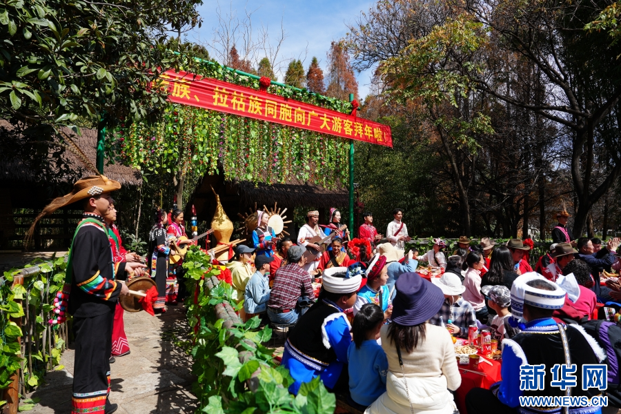 基诺族和拉祜族拜年(2月14日摄)。新华网发(云南民族村供图)