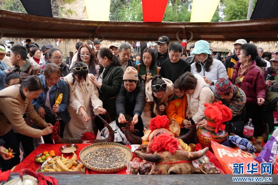 佤寨摸牛头、拴红线、送祝福(2月12日摄)。新华网发(云南民族村供图)