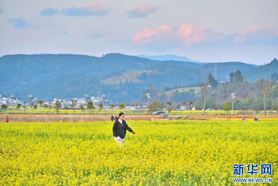 黄灿灿的油菜花点缀着山水田园(2月16日摄)。新华网发(吴再忠 摄)