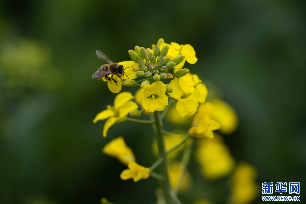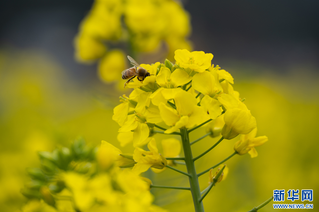 在油菜花间忙碌的蜜蜂(2月12日摄)。新华网发(刘起 摄)
