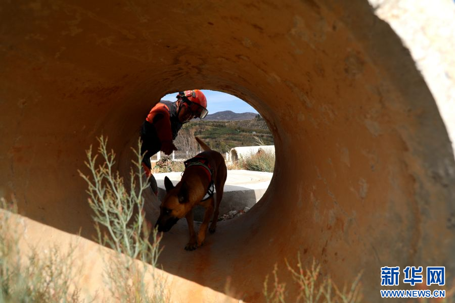 演练中,训导员正在让搜救犬进入狭小空间搜寻“被困人员”(2月19日摄)。新华网发(陈胜瑶 摄)