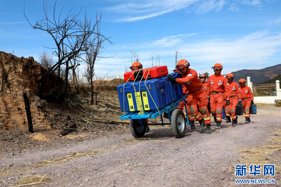 演练中,消防救援人员携带重型救援装备向“灾情点”前进(2月19日摄)。新华网发(陈胜瑶 摄)