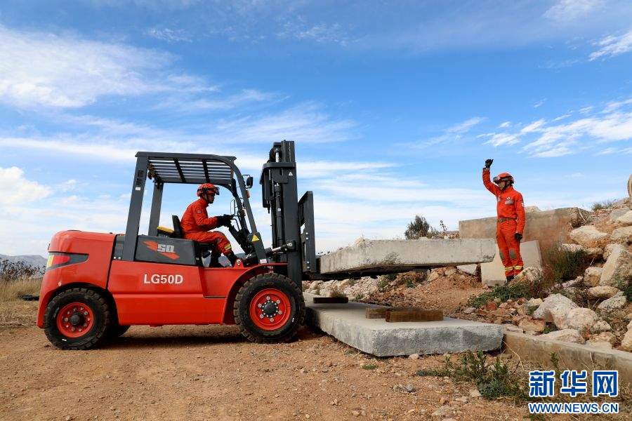 演练中,消防救援人员利用叉车移除大型障碍物(2月19日摄)。新华网发(陈胜瑶 摄)