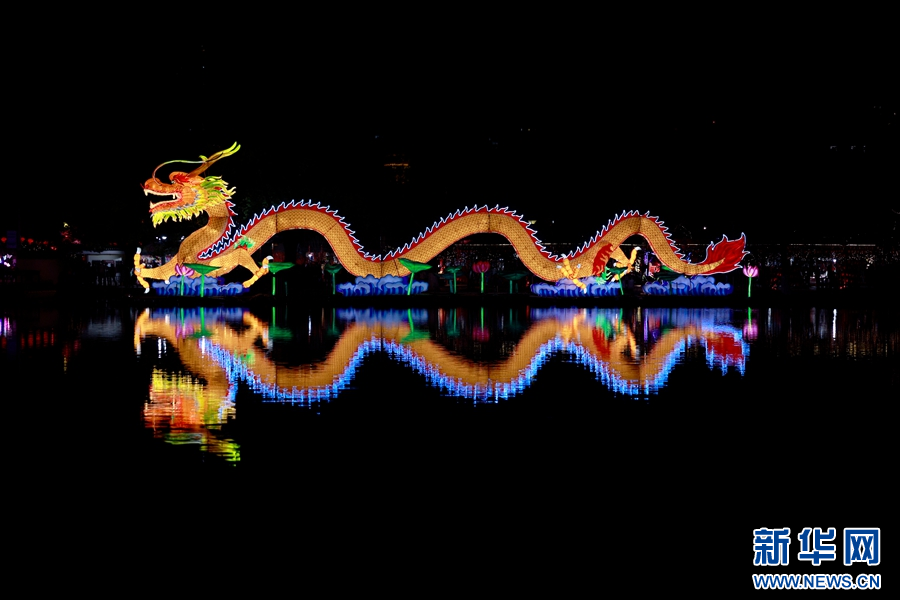 翠湖公园里的“龙腾盛世”主题水面灯光秀(摄于2月21日)。新华网发 (丁凝 摄)