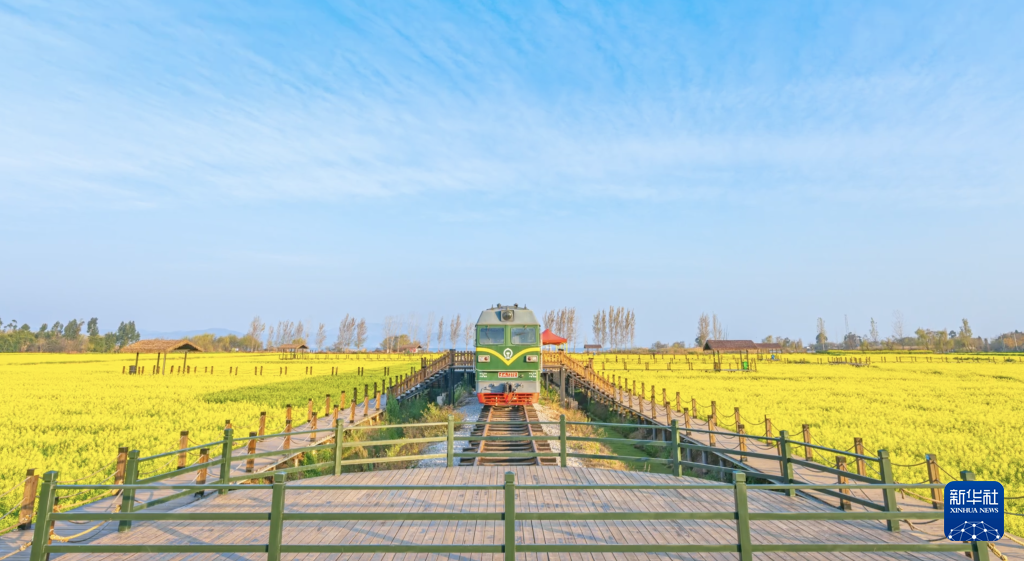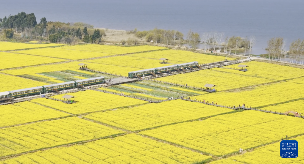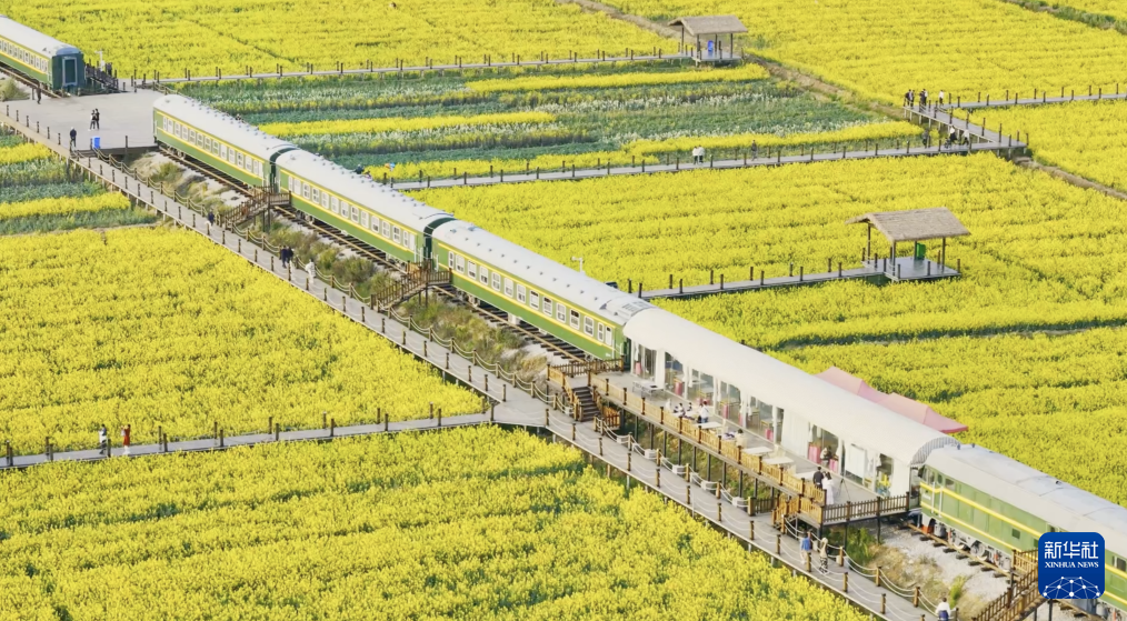 绿皮火车和游人在金色的花海中欢歌,仿佛奏响大地的一曲赞歌,唤起春天的生机与活力,展现乡村振兴发展新气象。