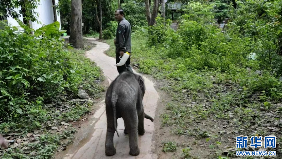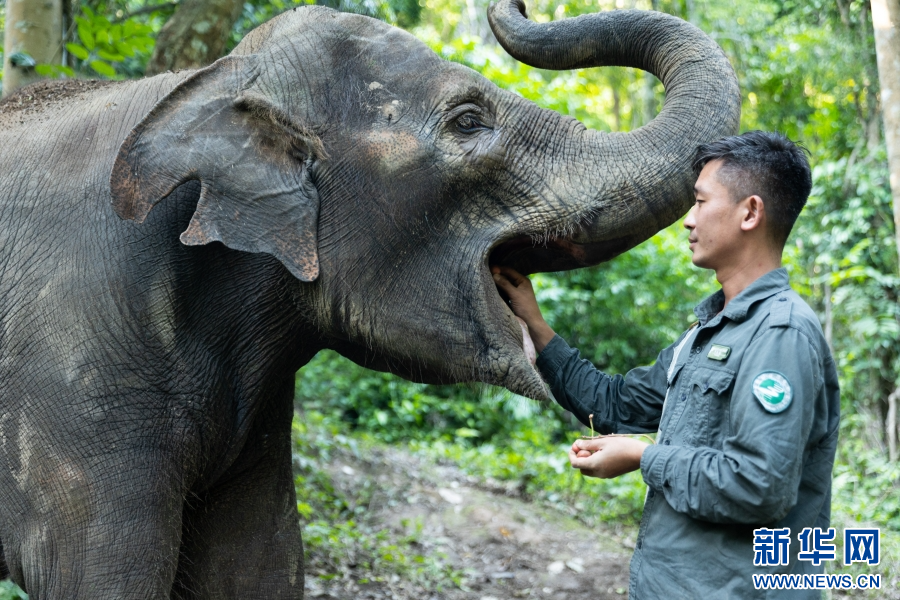 “象爸爸”邬绍能陪伴“小强”进行野化训练(2023年11月5日摄)。新华网发(刘云 摄)
