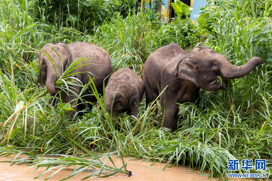 “平平”(左一)“然然”(右一)陪伴着“景景”在河道旁取食(2023年7月15日摄)。新华网发(刘云 摄)