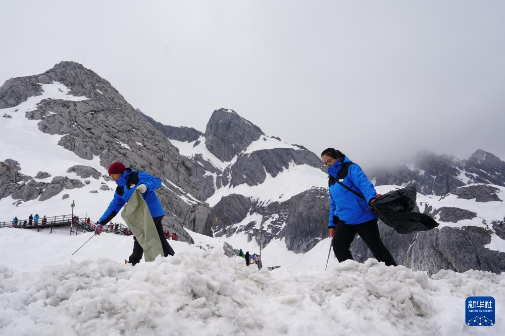 丽江玉龙旅游股份有限公司索道经营分公司景区部环卫三组组员和德军(左)与同事和兴兰在雪地上清理垃圾(3月26日摄)。新华社记者 陈欣波 摄