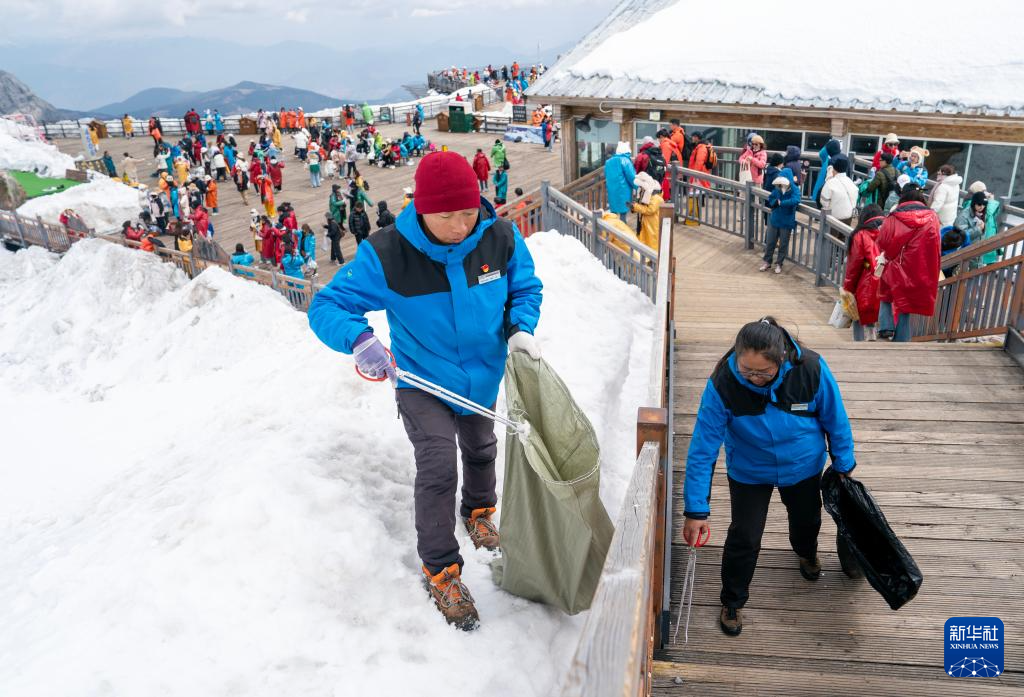 丽江玉龙旅游股份有限公司索道经营分公司景区部环卫三组组员和德军(左)与同事和兴兰在清理游客栈道外雪地上的垃圾(3月26日摄)。新华社记者 金立旺 摄