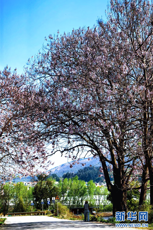 近日,在云南省安宁市,公路两旁的泡桐花悄然盛放,一簇簇淡紫色的花朵簇拥枝头,微风拂过,似风铃一般的花朵随风舞动。长约两公里的淡紫色花海,点缀着车来车往的乡村公路。(完)(安宁市融媒体中心)