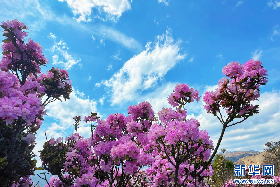 蓝天白云下的高山杜鹃花绽放(4月8日摄)。新华网发(剑川县融媒体中心供图)
