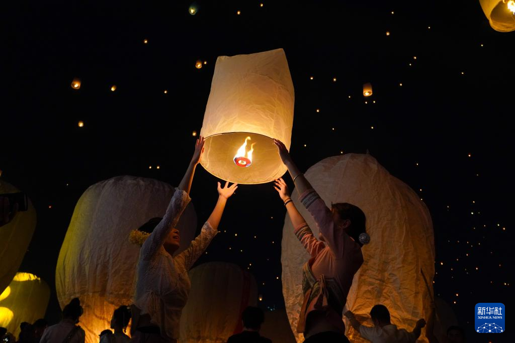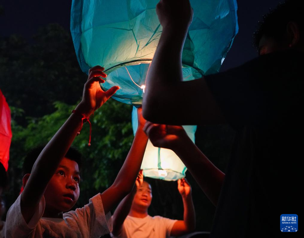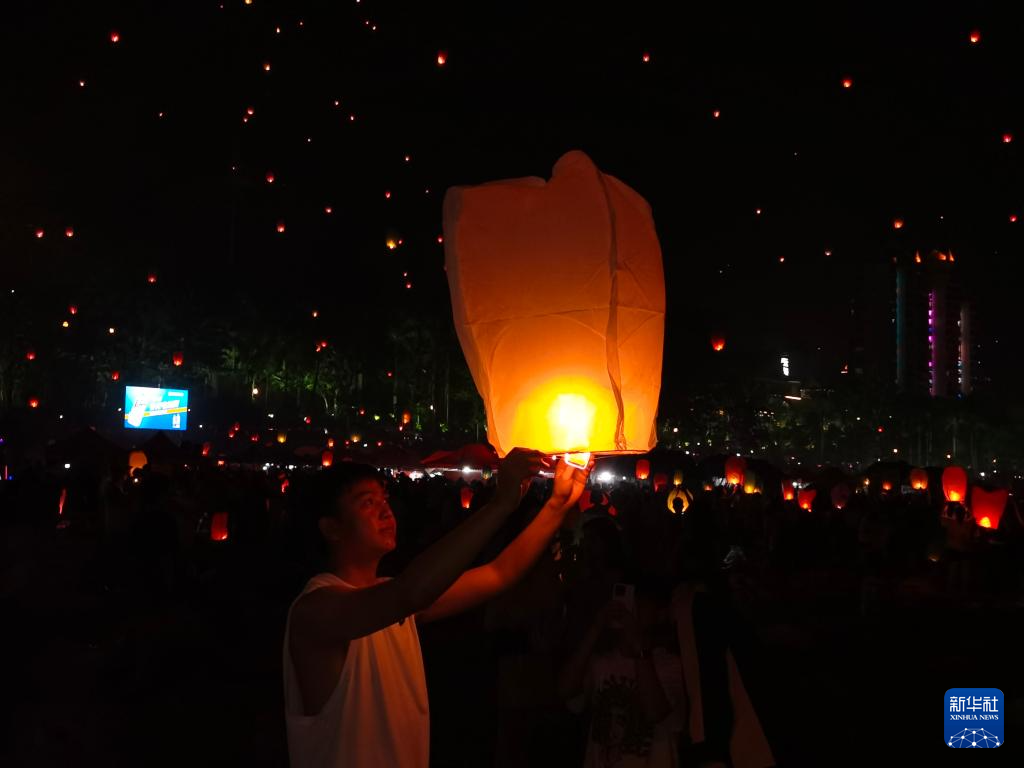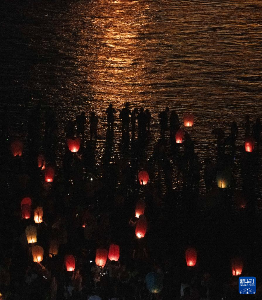 4月13日晚,人们在云南省景洪市澜沧江边放飞孔明灯。新华社记者 王静颐 摄
