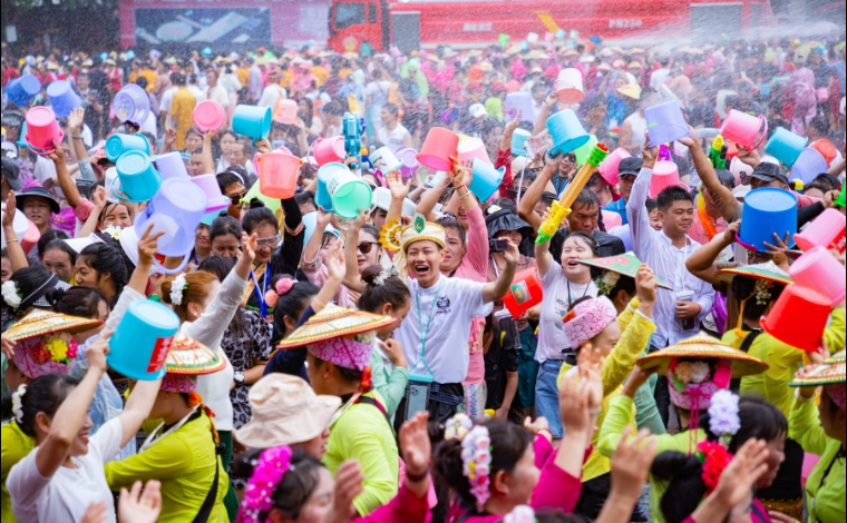 4月14日,“大美陇川”2024年傣族德昂族泼水节乡村泼水狂欢活动,在云南省德宏傣族景颇族自治州陇川县章凤镇拉勐村举行。伴着阵阵鼓声,人们跳起欢乐的“嘎伴光”,男女老少间互相泼水,互祝吉祥、幸福、健康。现场,祝福的水花四处飞溅,到处洋溢着浓厚的节日气氛。(完)(李易晨 尹兴朋)
