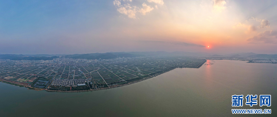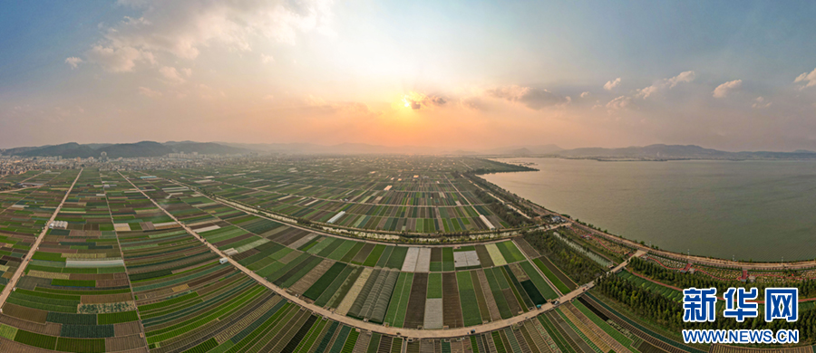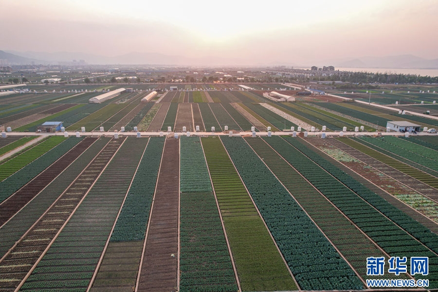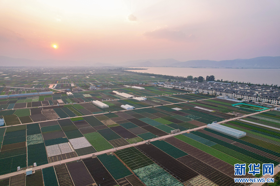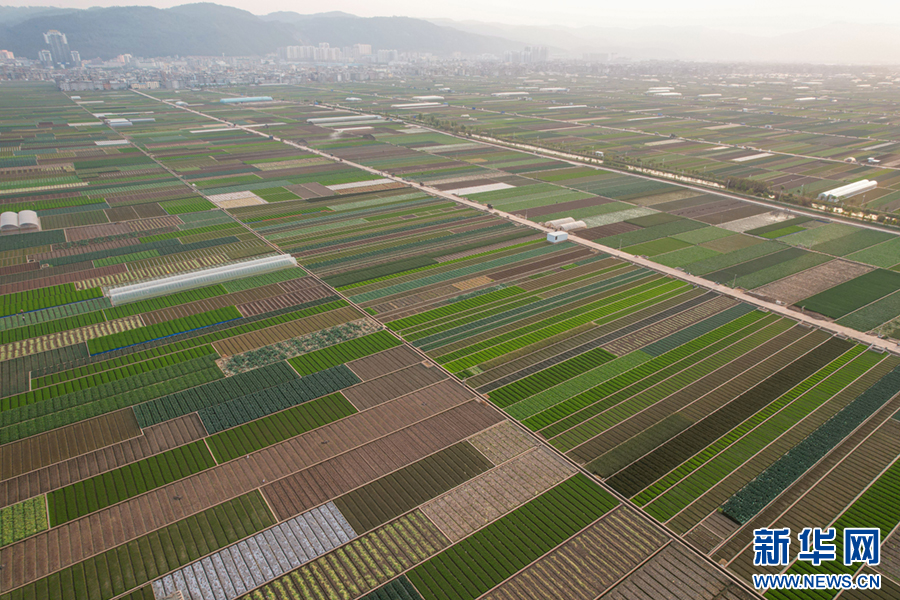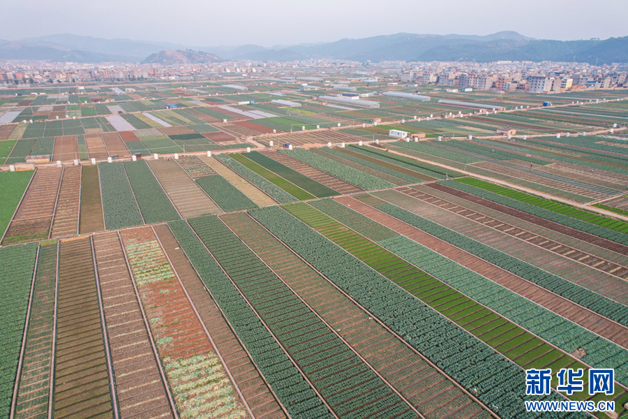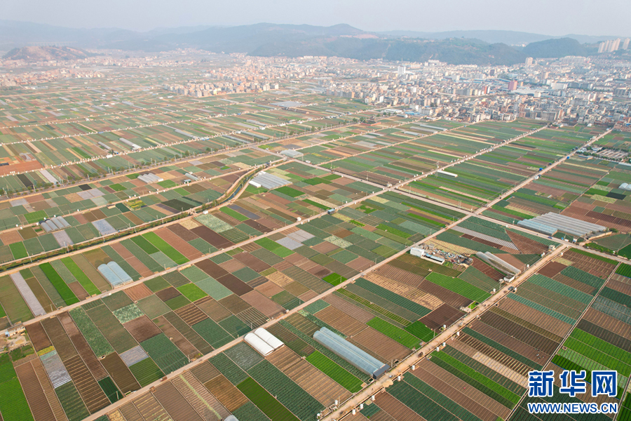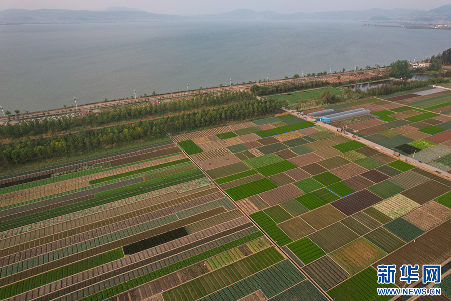 暖春时节,云南省玉溪市通海县蔬菜种植基地,压茬轮种的各类蔬菜长势喜人,平整规范的土地阡陌纵横、色彩斑斓,与村庄、山峦、湖泊构成一幅美丽的田园画卷。新华网发(杨俊鹏 摄)