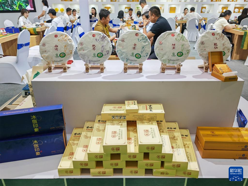 这是4月19日在第十六届中国云南普洱茶国际博览交易会上拍摄的茶叶展品。新华社记者 林碧锋 摄