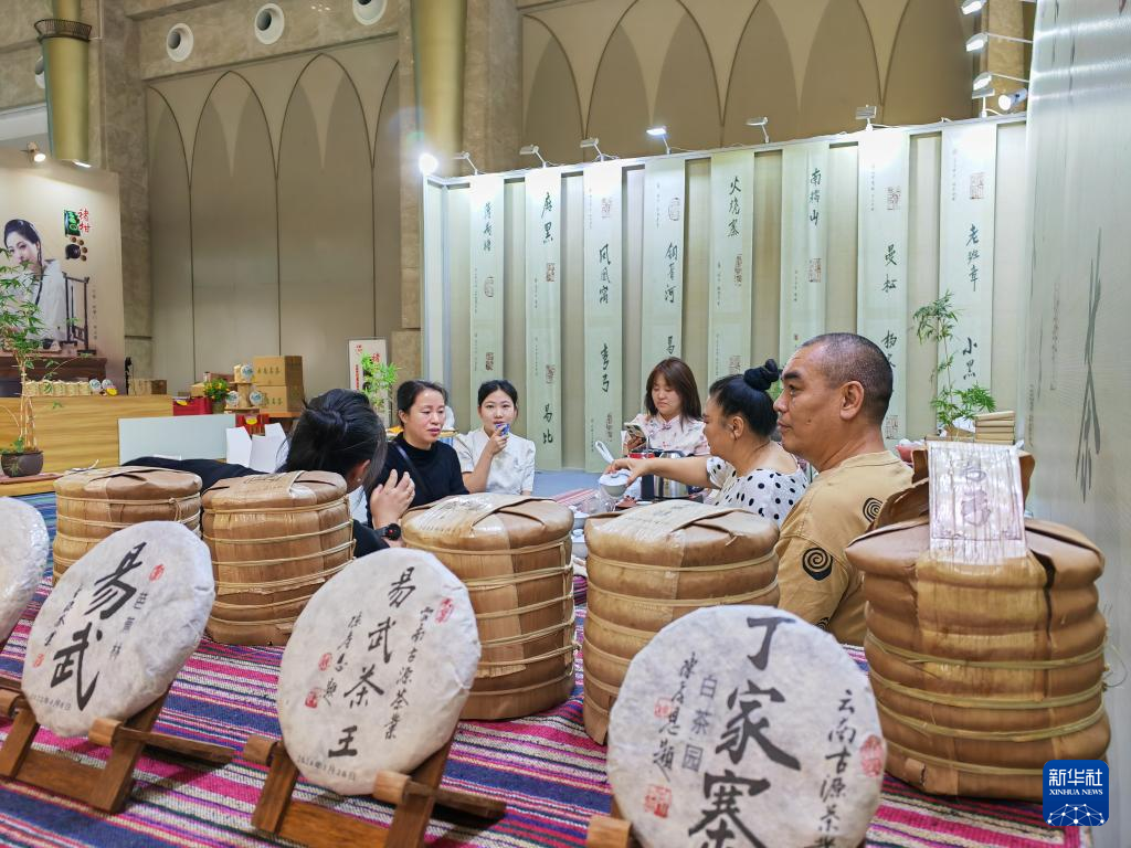 4月19日,参观者在第十六届中国云南普洱茶国际博览交易会上品茶交流。新华社记者 林碧锋 摄