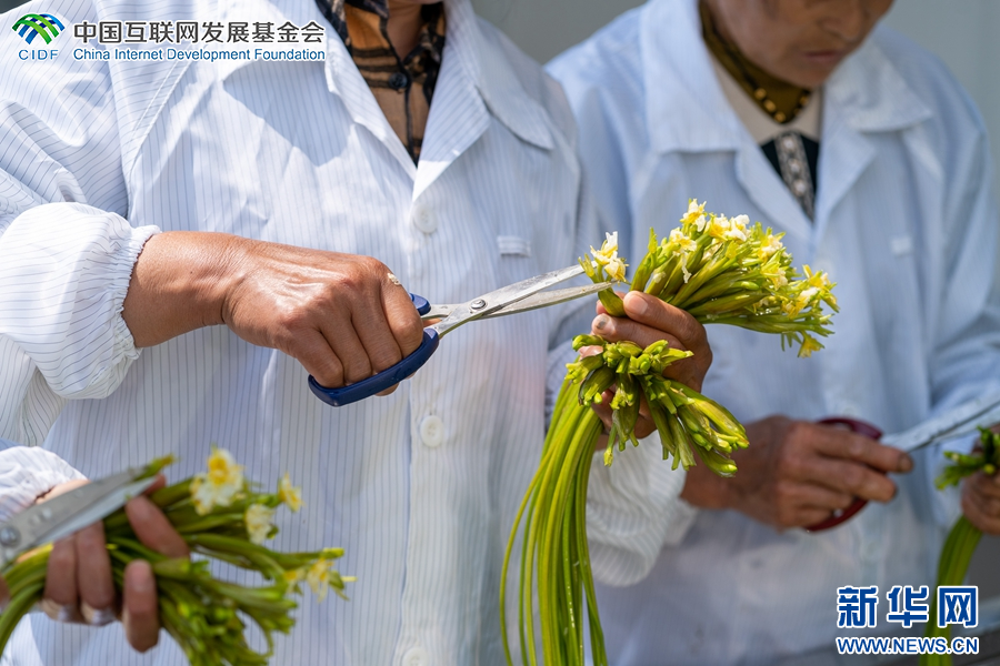 洱源海菜花研究基地,农户将海菜捆扎后装入盒子中(摄于4月16日)。新华网发(罗新才 摄)