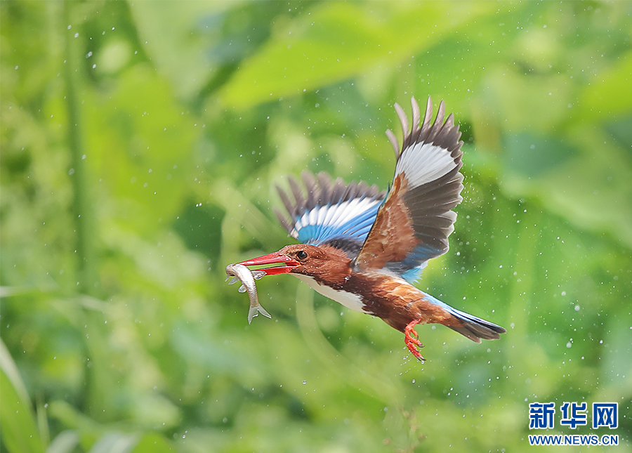 白胸翡翠起飞捕鱼(4月15日摄)。新华网发(杨学飞 摄)