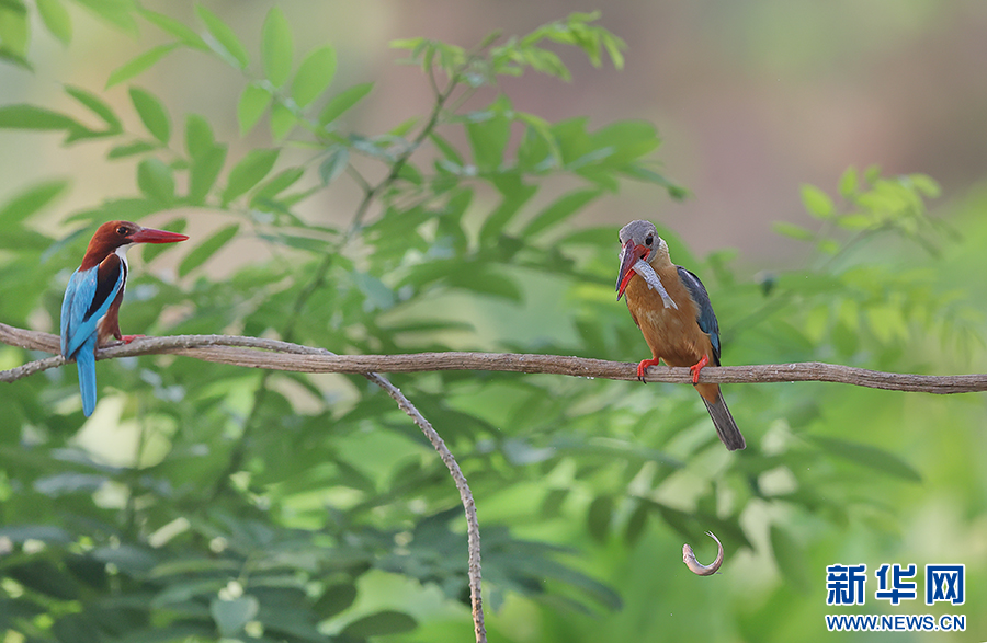 白胸翡翠叼着小鱼去喂雌鸟(4月15日摄)。新华网发(杨学飞 摄)