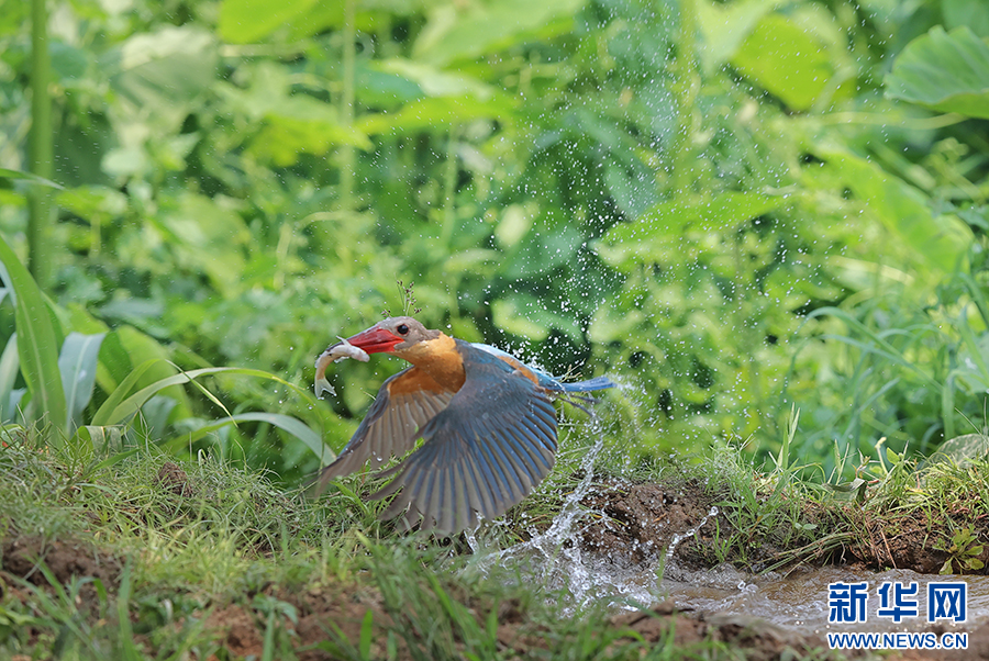 白胸翡翠捕鱼出水瞬间(4月15日摄)。新华网发(杨学飞 摄)